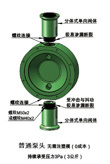 ![]() | 本公司的計(jì)量泵使用的是一體式泵頭。生產(chǎn)工藝是開(kāi)制塑料模具,然后使用模具生產(chǎn)泵頭。整個(gè)泵頭是一體式結(jié)構(gòu)。外至螺紋為考慮強(qiáng)度,螺紋可無(wú)限放大,泵頭注塑??刹捎锰土戏绞?,增加的成本并不會(huì)太多。這樣,泵頭所承受的壓力可以達(dá)到很高。而且泵頭非常結(jié)實(shí),強(qiáng)度是普通泵頭的兩倍以上。不會(huì)發(fā)生斷裂滲漏的情況,大大增加了計(jì)量泵的使用壽命。 |